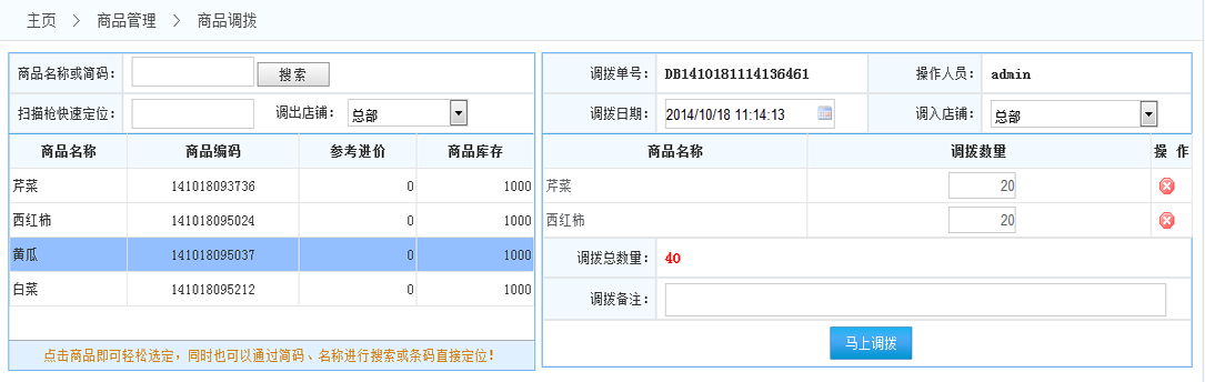 商品調(diào)撥:進(jìn)入商品調(diào)撥界面, 如下圖: