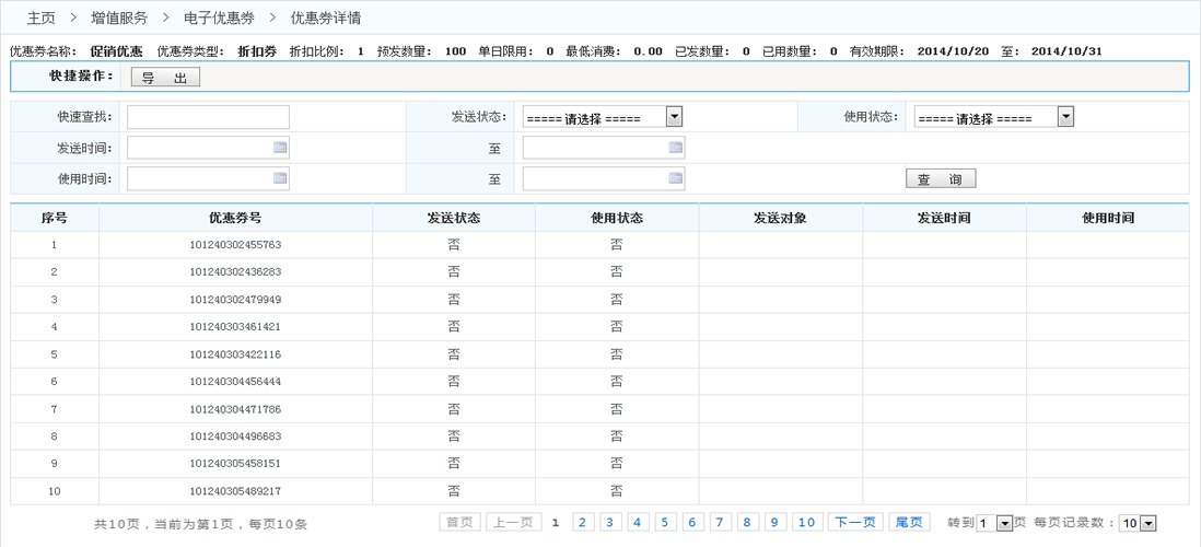 查詢提交:可以根據(jù)提供的一些條件分類,查出所需要的數(shù)據(jù)(包括發(fā)送狀態(tài) 使用狀態(tài)以及時間等條件)
